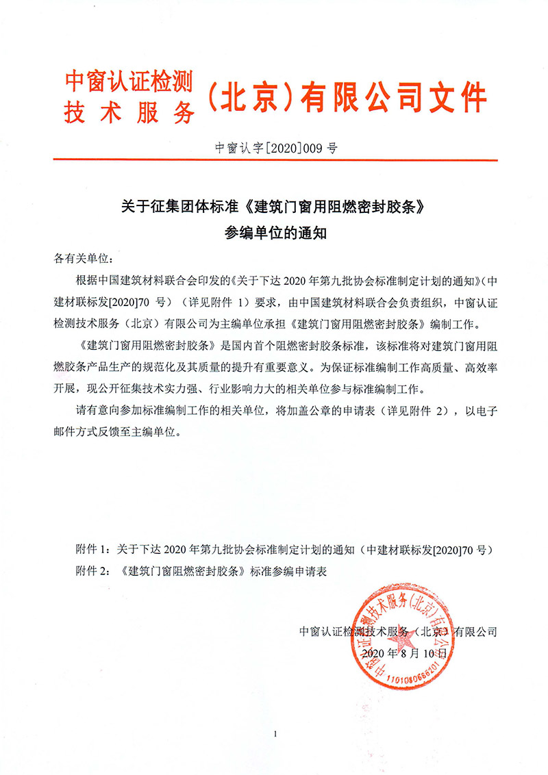关于征集团体标准《建筑门窗用阻燃密封胶条》参编单位的通知